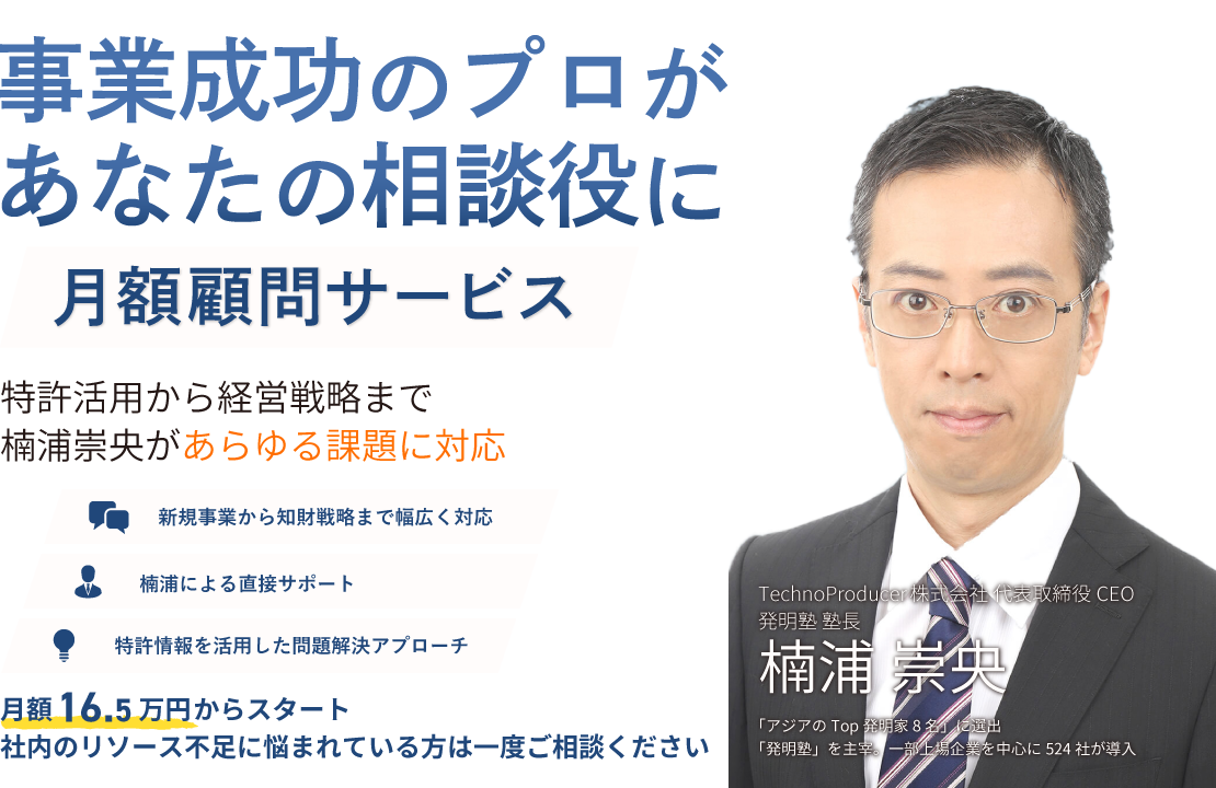 月額顧問サービスは、発明塾の塾長である楠浦が直接対応することで、豊富な知識と経験を生かして専門的なサポートを提供します。発明塾の知見を活用し、お客様のニーズに合わせた柔軟なアプローチを実現します。