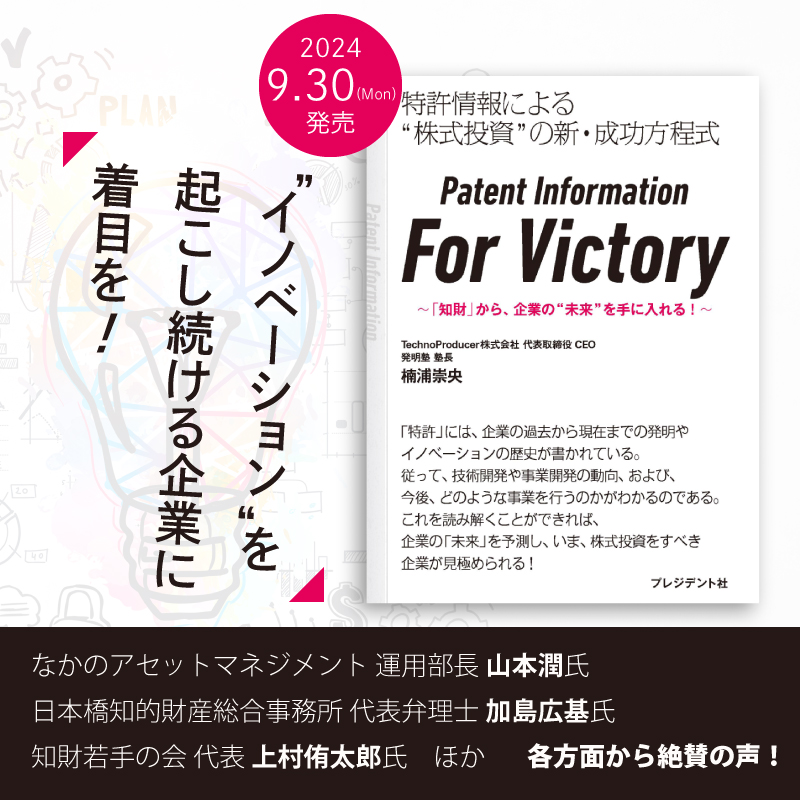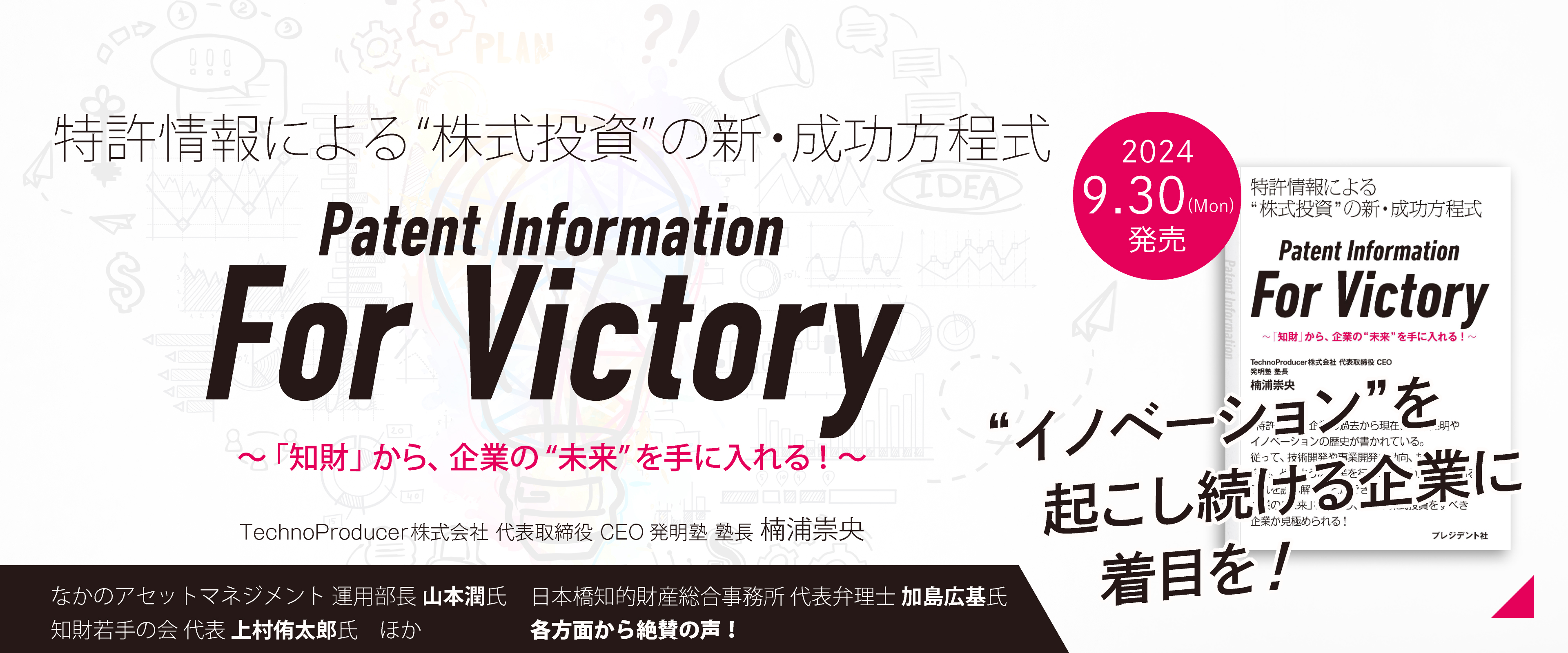 書籍「Patent Information For Victory ――特許情報による"株式投資"の新・成功方程式――」の知見を活用し、以下の内容で新規事業創出のための社内セミナーの依頼をお受けしております。
